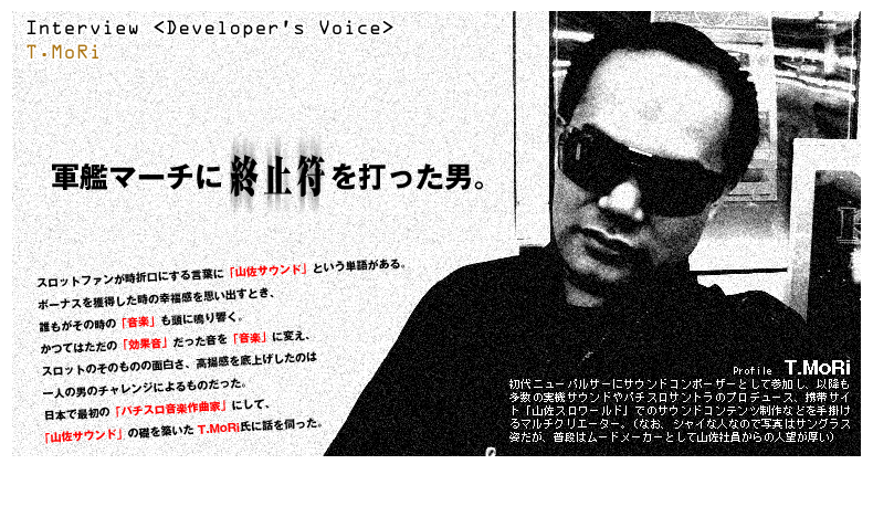 T.MoRi ニューパルサーの開発初期の名前は実は「パルサーエース」だったりします。 後々、諸事情により社長が「パルサーエース」を「ニューパルサー」に改名しました。 なので、当初はパルサーエース用のビッグボーナス曲も用意しました。 しかも歌詞付きで(笑)。 曲データは現存していませんが、歌詞は頭の中に残っています。 「いざ、パルサーエース、その力を見せてやれ!」と、とても短く強気な歌詞です、ハイ。 ―― それでは、作ってボツにした曲があるということですか? T.MoRi レギュラーボーナスの曲は「パルサーエース」と「ニューパルサー」では殆ど同じで、低音があるか、無いか程度の違いでした。 それ以外は「パルサーエース」独自の曲でしたが、ボツにするのが惜しかったので、 少し手直しして、ファンファーレ音を「ピンクパンサー」に使用したりしました。 終了音も、後の「セブンリーグ」のエラー音に使用したのですが、これはあまりにも静かな曲で、エラーという感じじゃなかったかも・・・。 今考えると「パルサーエース」はお蔵入りして正解だったのかも知れません(笑)。 「ニューパルサー」の終了音は次機種用に作曲していたボーナス曲をアレンジして搭載しました。 ですが、元々ビッグボーナス曲用として準備していたものなので曲が長かったんですよ。 そのため「いつまでも終了音が流れるのは良くない」という開発側意見と、「全部を聴かせたい」という私の意見が対立しました。 苦肉の策として結局、曲のテンポをかなり上げて、一応曲を終りまで鳴らすようにしました。 その結果、なんだかチンドン屋さんっぽい音になっちゃいましたけど(苦笑)。 エラー音は開発当初から変わっていません、初めからピーポーピーポーと鳴らしたかったので。 先駆者だからこその苦悩と対立、そして成功 ―― 14年前当時、サウンドの周囲の評価はいかがだったのでしょうか。 T.MoRi 社内では最初「低音なんてホール内の騒音の中で鳴らしても意味が無い」とか「リズムなんて聞こえないのに作る意味があるのか?」とか、実は散々な評価だったんですよ。実際、世に出るまで「(音楽は)まぁ、無いよりマシ」とまで言われるほど音楽の価値そのものが全く認められてなかったんです。 ですが、いざ蓋をあけてみるとユーザーさんからはもちろん、販売を委託している ディーラーさんからも大絶賛でした。 当時の業界では「有り得ない」「タブー」とも言われた低音とリズムを使ったり、他社に先駆けてFM音源によるメロディー制作には、最初、不安や戸惑いもありました。 ですが、曲を皆さんに認めていただいた事で自信がつきましたし、 現在のパチスロサウンドの基礎を築き上げたのは私だ!と今も誇りに思っています。 そうそう、当時の音楽への感想で「とても綺麗なメロディーだ、女性が作ったのか?」と言う声もいただきました。当然ながら私は男ですので(笑)。<※> <※>繊細さを評価されてちょっと嬉しかった、という意味です。 MoRi氏にそういう趣味があるわけではございません。念のため。 ―― 最後に、T.MoRiさんにとって「ニューパルサー」とは? T.MoRi 例えて言うなら、プロデューサーとアイドルのような関係でしょうか。 手塩にかけて育て上げた「ニューパルサー」がここまで来れたのも、ひとえにユーザーの皆様方のお陰だと思っています。 4号機の「ニューパルサー」はもうすぐ引退の時期となりますが、サウンドとともに、いつまでも皆様の記憶の片隅に留め続けて頂ければと思います。 |