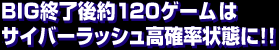 BIGボーナス終了後の約120ゲームは、サイバーラッシュへの突入率が大幅にアップ!BIGからのサイバーラッシュ連打で、一気に大量獲得のチャンス!BIGボーナスへの期待がますます膨らみます。