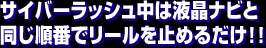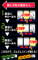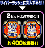 サイバーラッシュ中は液晶表示の通りにボタンを押すだけで、どんどんコインが増える!目押しの技術や特別な知識は何もいらないから、初心者やミドル層プレイヤーも安心。誰が打っても、確実に、スピーディーに大量コインを獲得することができます!さらに、この液晶ナビゲーションをBBやRBのボーナス中にも採用。