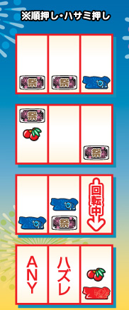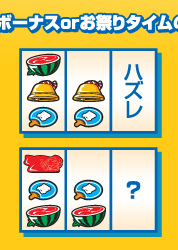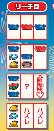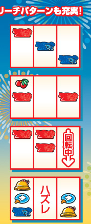 中段チェリー 中段チェリーを引けば焼く1/3でボーナス放出!? スイカ スイカが斜めに揃えばお祭り騒ぎ!? リプレイ 4連続でリプレイが揃えばボーナス確定!?