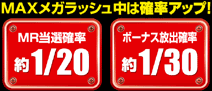 スタートレバーのたびに行われるAT抽選。「ボーナス終了後」や「特定のハズレ目を引いた時」に抽選されるATとは異なり、MRは出目やプレイ数に関わらずいつでもチャンスが!しかも[メガマックス]では、ボーナス放出も毎プレイ抽選。どのゲーム数からでも同様に期待感あふれるプレイが楽しめる。