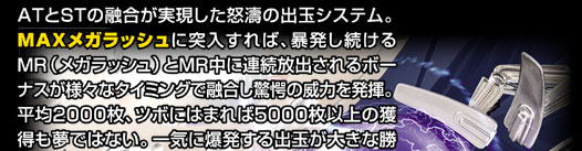 毎プレイいつでも、怒涛のMAXメガラッシュがスタートするチャンスがあるから、どんなシーンでも高まり続けるボルテージ。この熱い興奮からは、もう誰も逃れられない。 |