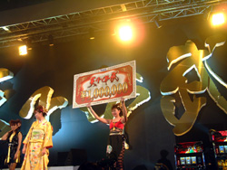 | 矢を使って箱の中の番号を引き当てます。コンパニオンの子も和風姿でカワイイです。 |