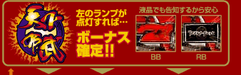 そしてチャンス目出現時やビッグ終了時は、ボーナス期待度がUPする「覚醒モード」突入のチャンス! 様々なルートがあるから、「天下布武」ならいつ、どこからでも大勝利へのチャンスが訪れます。さらに、まれに出現する「決戦RB」は大勝利を約束する"ビッグバン"のチャンス! |