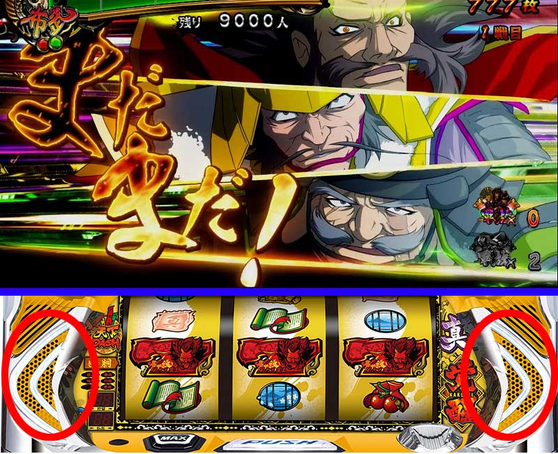 追撃時にPUSHボタン押すと、リール横のランプ色で追撃の継続率示唆