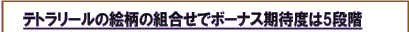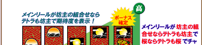 テトラリールがボーナスの期待度を教えてくれる「こいこいチャンス」。メインリールで同系絵柄の組合せが揃うと、こいこいテトラが回りだす!テトラに止まった絵柄で、ボーナスの期待度を表示します。