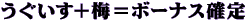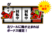 スタートレバーでテトラにうぐいすが現れた時、左リールに梅が止まれば、それだけでボーナス!梅が止まらなくても、うぐいすの鳴き声が、ボタンを押すたびに響けば、OK!
