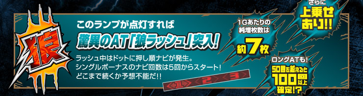 「狼ラッシュ」突入の高確率ゾーン ボーナス終了後は「狼ラッシュ」への突入率UP! 通常プレイ中いきなりランプ点灯で「ワイルドチャンス」突入!